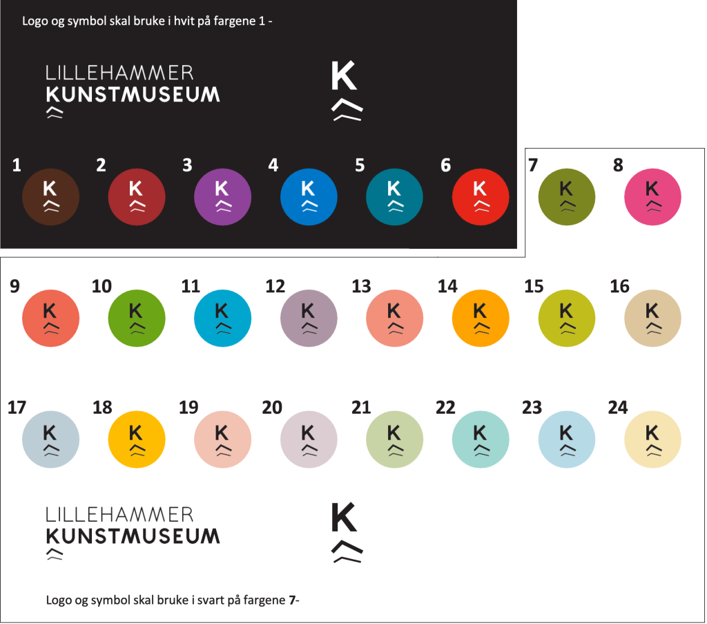 For universell utforming på nett anbefales det å bruke hvit logo/symbol mot bakgrunnsfargene 1–5 og svart logo/symbol mot bakgrunnsfargene 6–24.